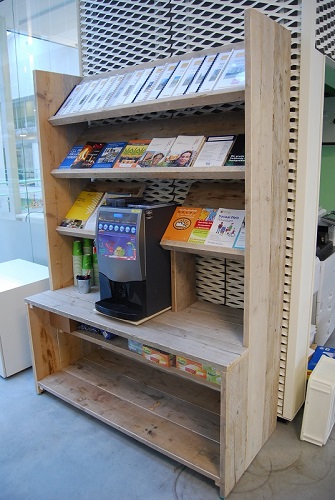 Deze folderkast met plek voor het koffiezetapparaat is gemaakt van gebruikt steigerhout, maar zeker ook in nieuw steigerhout te leveren.