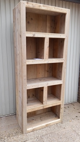 Deze boekenkast met vakken is te leveren in nieuw en gebruikt steigerhout, in elke maat. Standaard is de maat 80x180x40